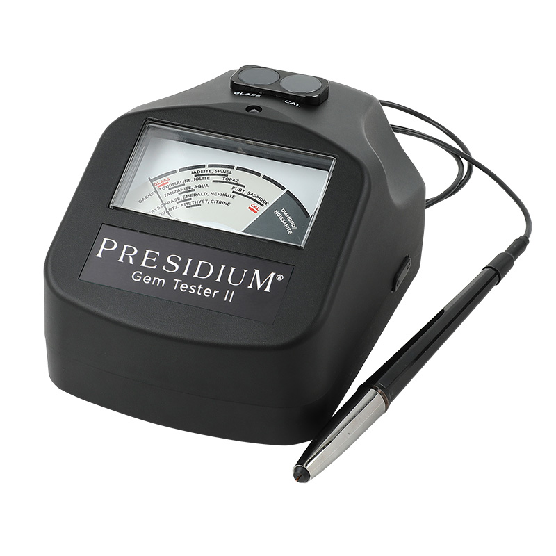 Presidium Gem Tester II provides a quick and easy way to identify diamond / moissanite and separates up to 16 common colored gemstones based on their thermal conductivity with its clear and direct analog display. It features the thinnest retractable probe tip (0.6mm) for testing colored gemstone as small as 0.02 carats. Coated gemstone can also be generally tested.