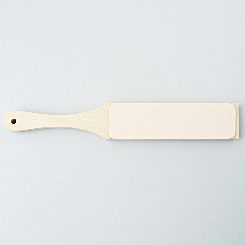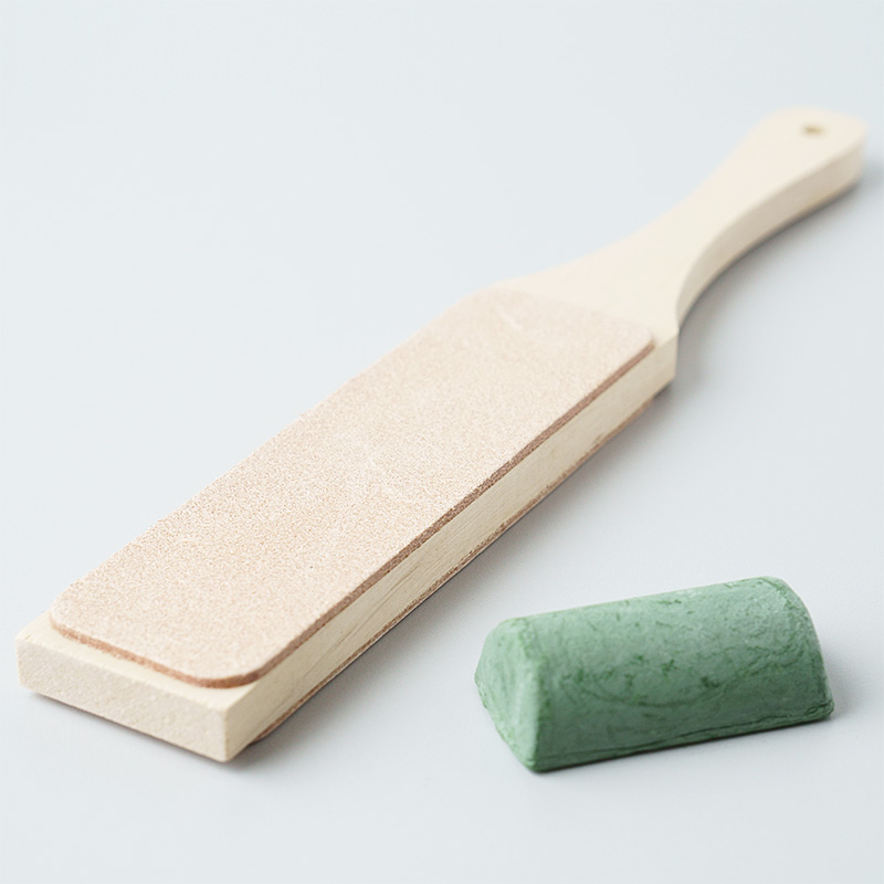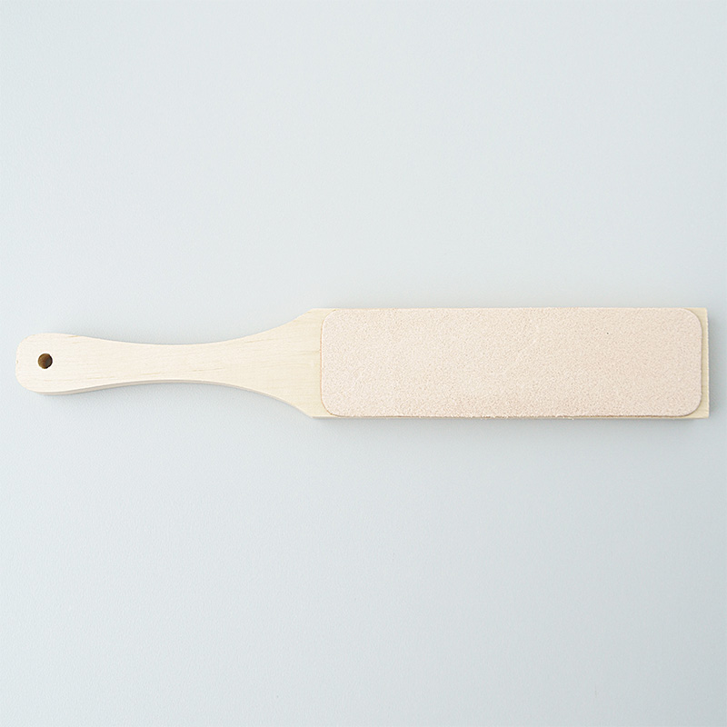 The strop comes with two sides: flesh side (rough) and grain side(smooth).